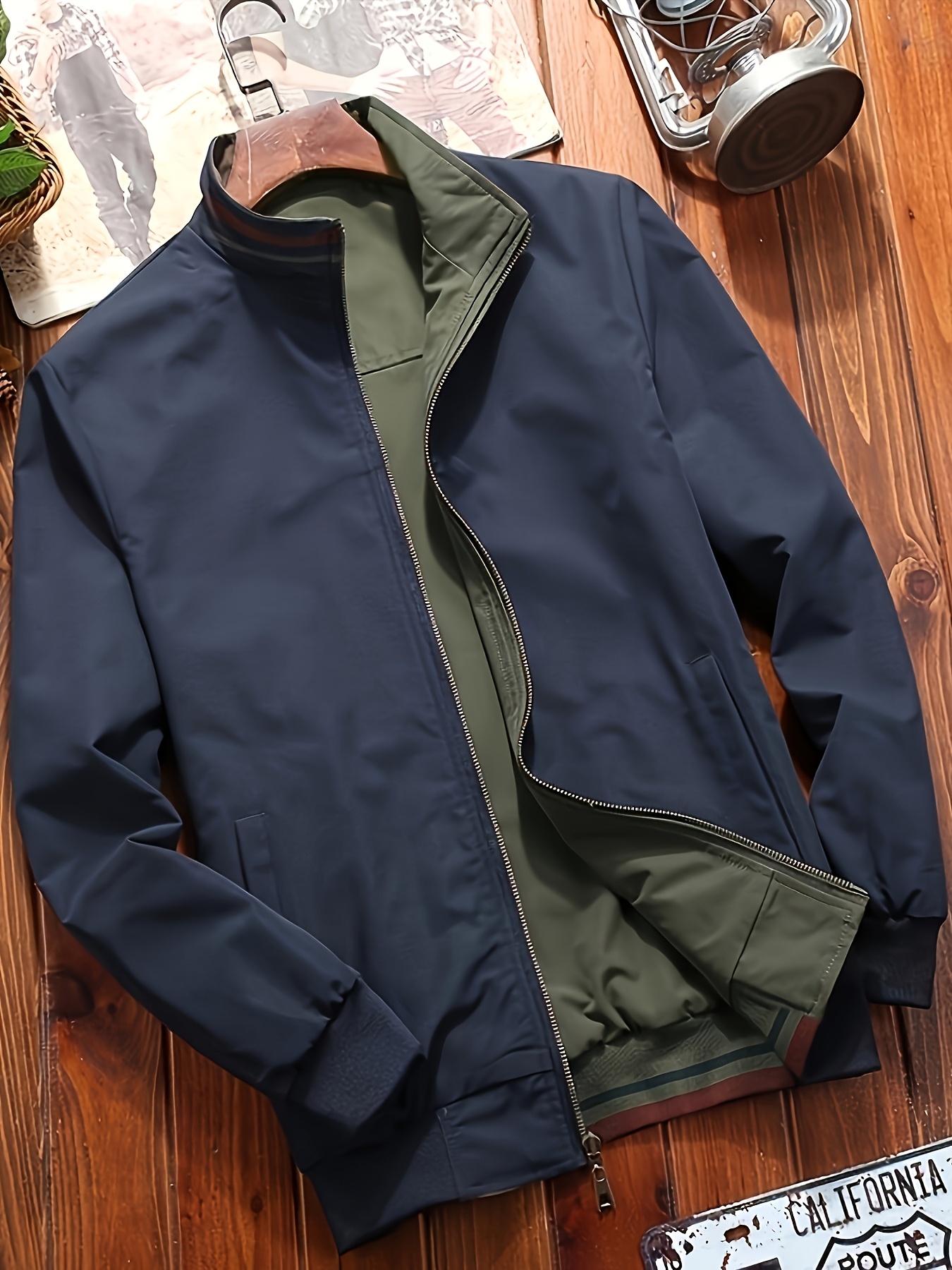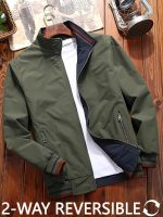 Home Men's Jackets &Coats Men’s Reversible Jacket – Front & Back Flip-Flip Design, Zippered Pockets, Stand Collar – Olive Greenu002F Navy Blue Two-Tone – Work, Outdoor, Everyday Coat – Machine Washable Non-Stretch Fabric, Casual Outerwear, Striped Detail, Jacket