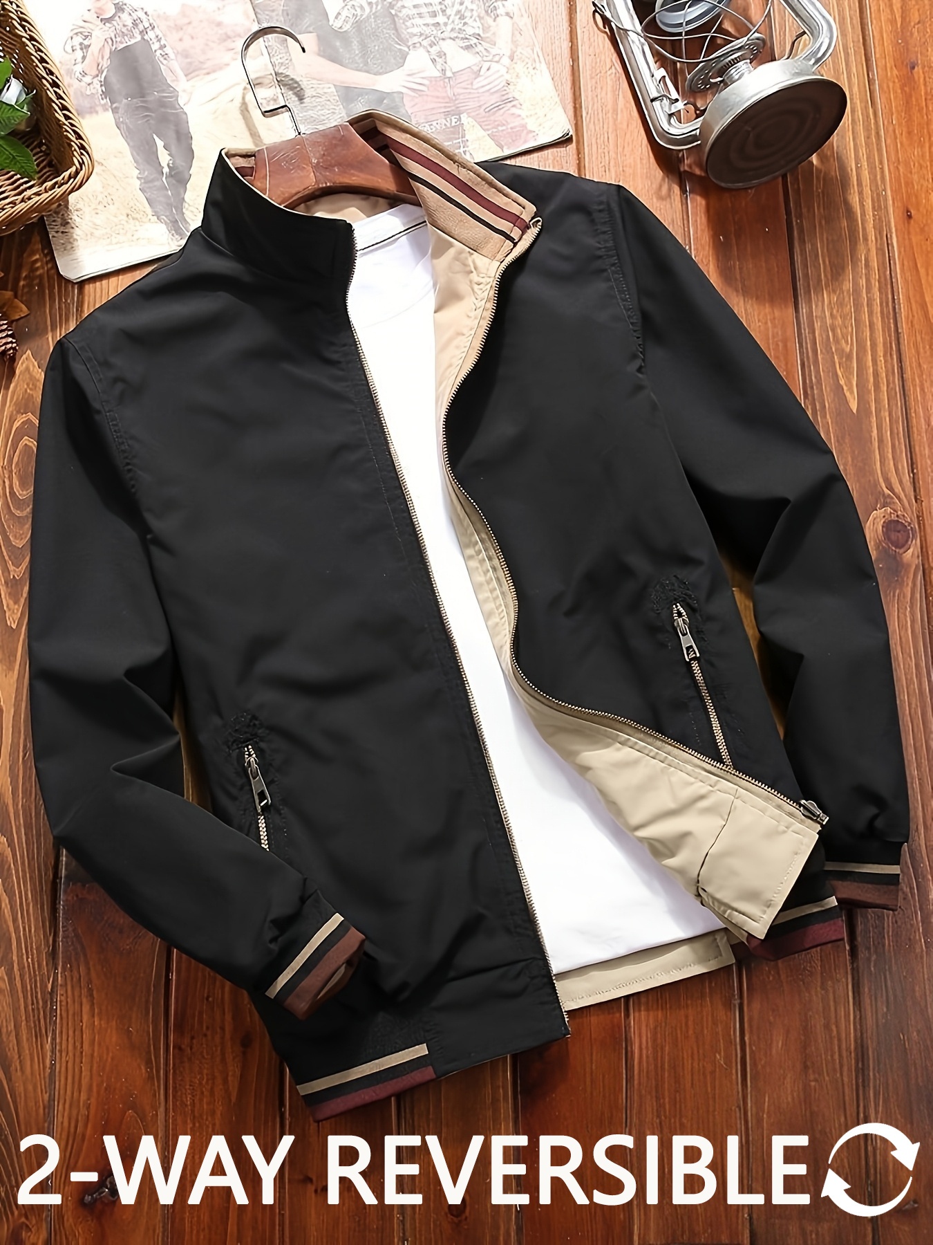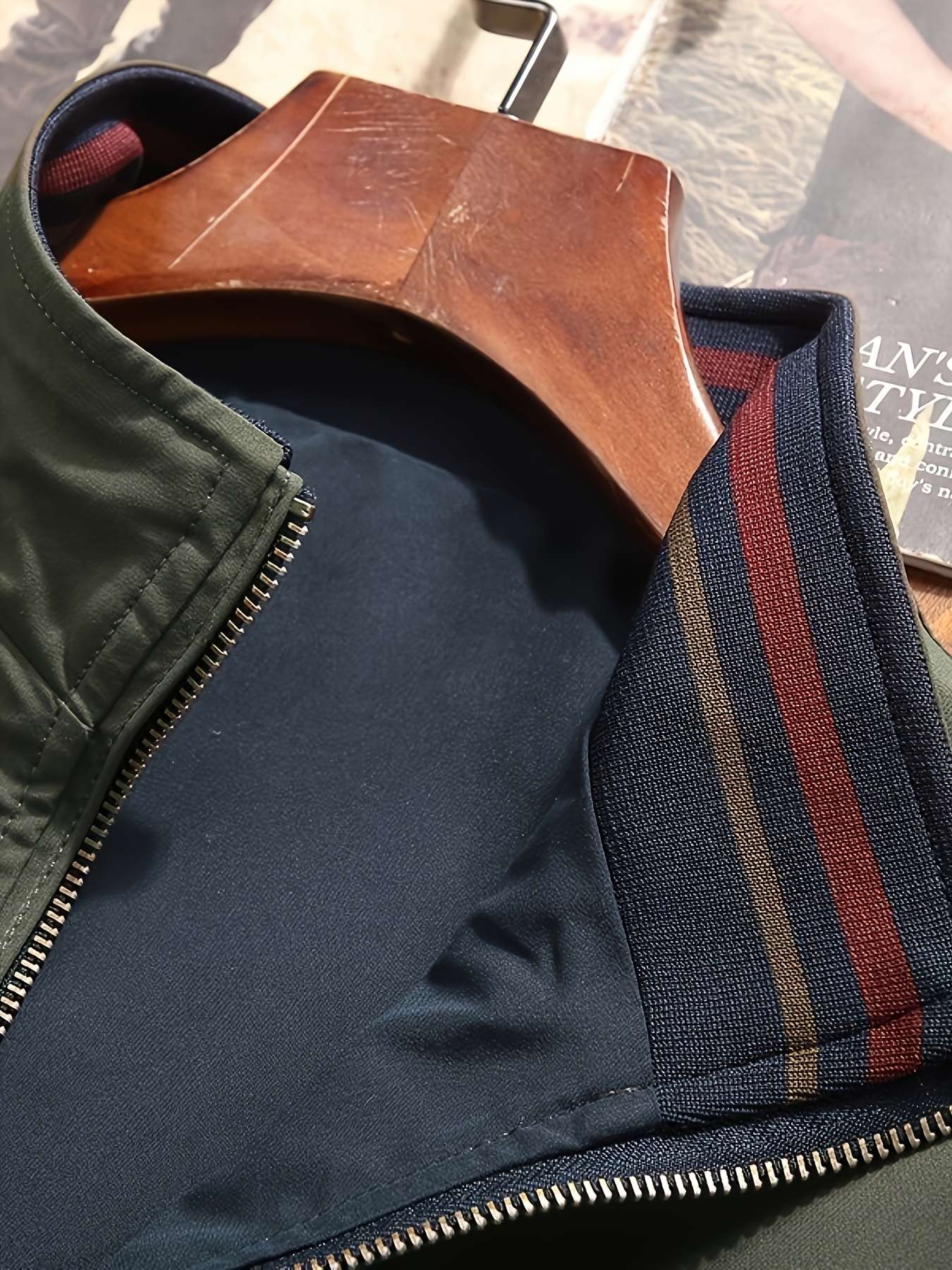 Men’s Reversible Jacket – Front & Back Flip-Flip Design, Zippered Pockets, Stand Collar – Olive Greenu002F Navy Blue Two-Tone – Work, Outdoor, Everyday Coat – Machine Washable Non-Stretch Fabric, Casual Outerwear, Striped Detail, Jacket