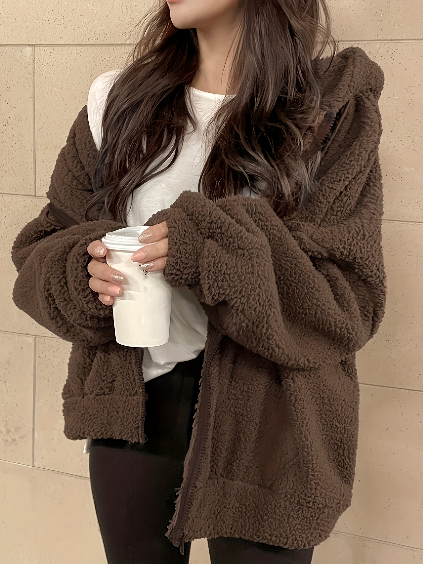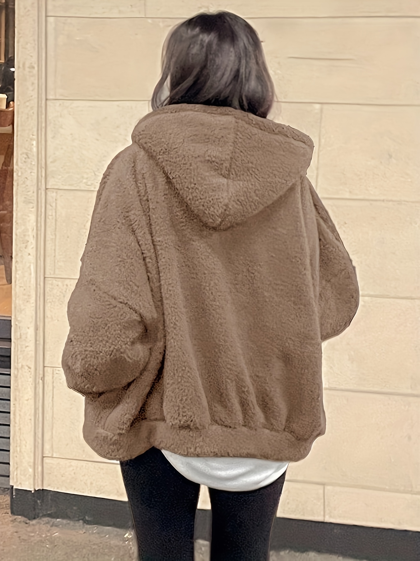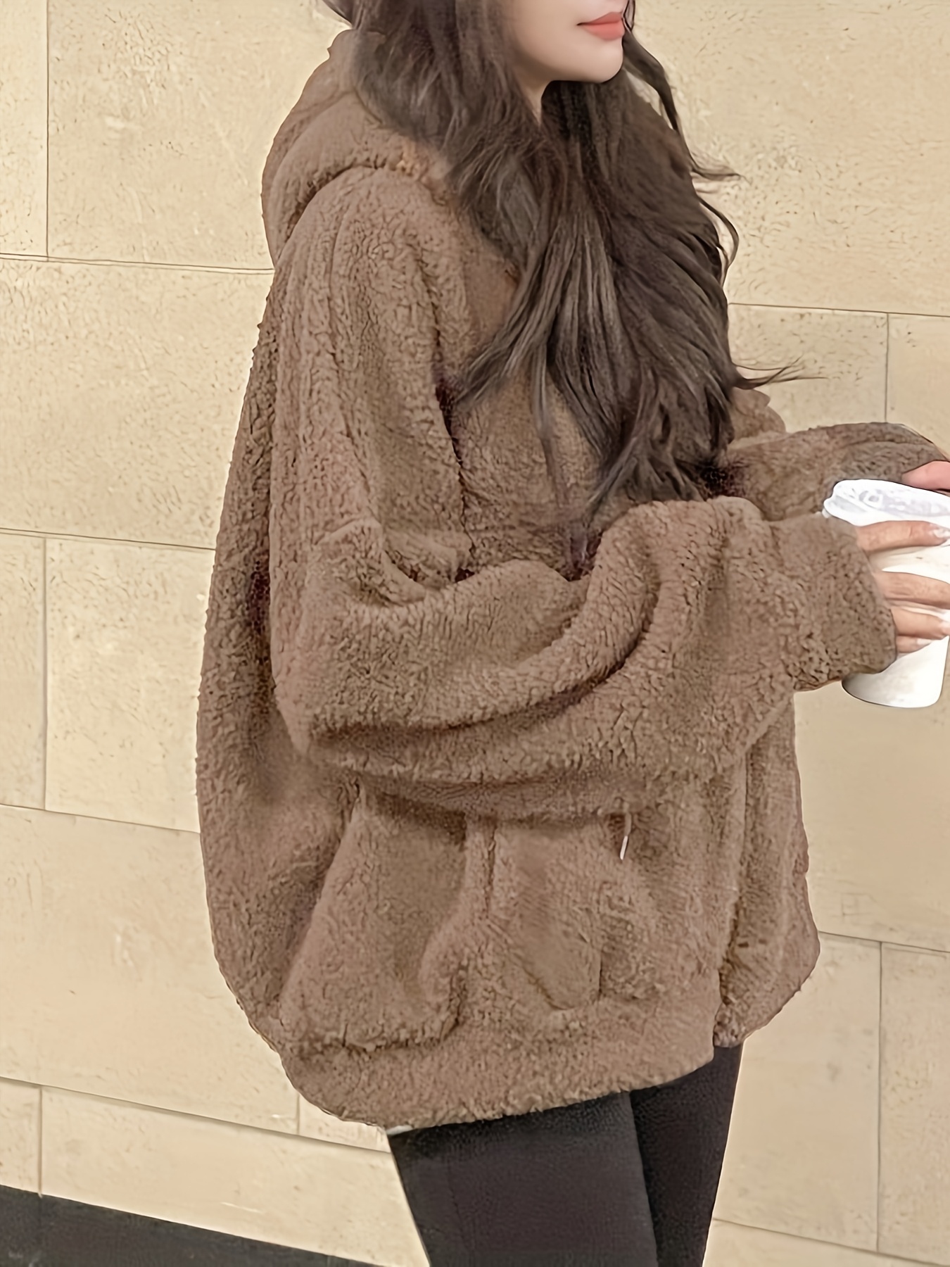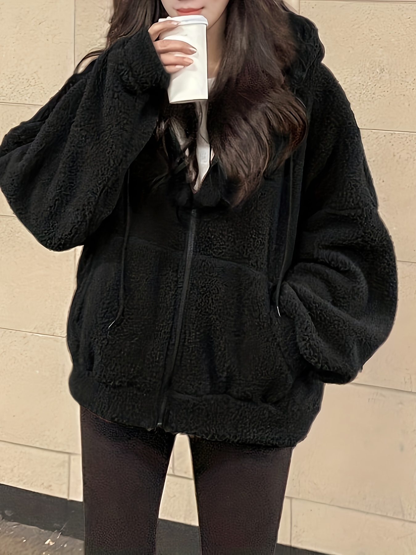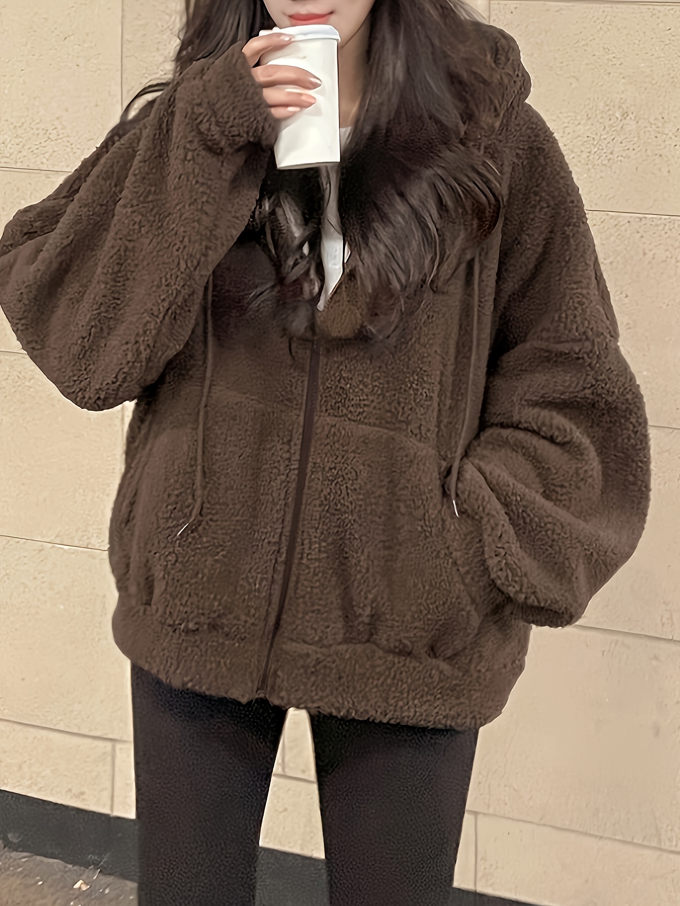 YY0718154 Solid Color Drop Shoulder Zip Teddy Hoodie, Women’s Late Autumn Casual Drawstring, Pocket, Zip Long Sleeve Hooded Oversized Regular Drop Shoulder Zip Women’s Hoodie, Long Sleeve Top