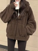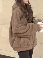 Home Women's Sweatshirts YY0718154 Solid Color Drop Shoulder Zip Teddy Hoodie, Women’s Late Autumn Casual Drawstring, Pocket, Zip Long Sleeve Hooded Oversized Regular Drop Shoulder Zip Women’s Hoodie, Long Sleeve Top